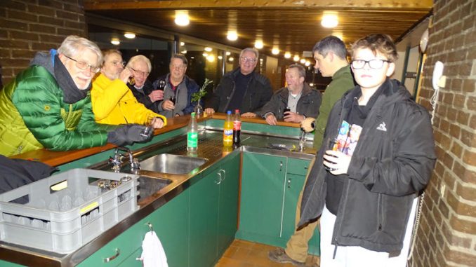Nach getaner Arbeit stellte Peter Quack seine Pläne für die neu gestaltete Krippe den Helfern vor. Beim wiederholten Auf- und Abbau sind Teile abgebrochen oder nicht mehr ganz fest zu verschrauben. Die Elektrik schwächelt und außerdem wird es immer schwieriger ausreichend Helfer für Auf- und Abbau der vielen Figuren und Podestteile zu finden. Quack hat die Konstruktion der neuen Krippe deshalb deutlich kleiner gehalten. In der kommenden Woche werden einige Tell-Kameraden die neuen Pläne dem Pfarrer und zwei Vertretern der Pfarrgemeinde vorstellen.