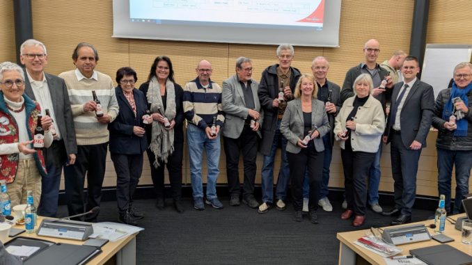 Ratingen. Mit einem herzlichen Dankeschön für die teils über viele Jahre geleistete ehrenamtliche Arbeit verabschiedete Bürgermeister Patrick Anders bei der Ratssitzung am 16. Dezember 13 ehemalige Ratsmitglieder, die nach der Kommunalwahl im Herbst aus dem höchsten Beschlussorgan der Stadt ausgeschieden sind. Als Geste des Danks und zugleich als Begeisterung auf das bevorstehende Stadtjubiläumsjahr 2026 überreichte Anders ihnen je eine Flasche des frisch gebrauten Jubiläumsbiers „1276“.