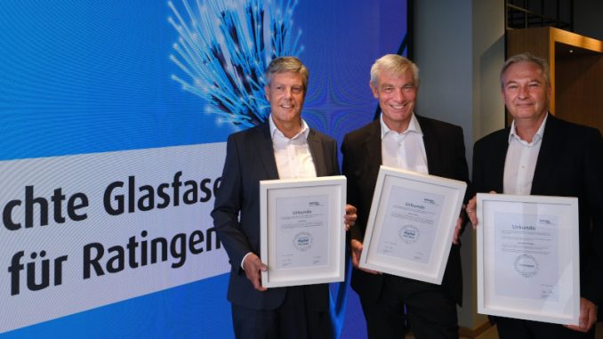 Neben der feierlichen Zertifikatsübergabe an die KomMITT, vertreten durch ihren Geschäftsführer Stefan Hermes, ehrte die BREKO auch zwei Politiker, die maßgeblich dazu beigetragen haben, um den Weg zur Glasfaser zu ebnen und den Ausbau in Ratingen über die Jahre konsequent weiterzuverfolgen. Der Verband verlieh Bürgermeister Klaus Pesch und Ratsmitglied und Stadtwerke-Aufsichtsratsvorsitzendem Gerold Fahr den Titel „Digitalpolitiker“, um ihr außerordentliches Engagement für den Glasfaserausbau zu würdigen.