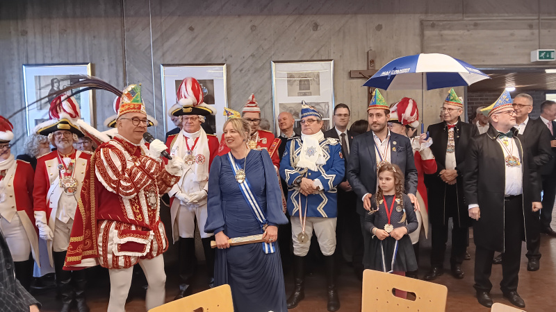 Das Königspaar Alexander und Marika Schleip hieß die zahlreichen Gäste ebenfalls willkommen. Dann begrüßten die Schützen das amtierende Ratinger Karnevalsprinzenpaar Jörg I. und Claudia III. mit ihrem Gefolge. Das Prinzenpaar übergab Karnevalsorden und sang schließlich sein Karnevalslied. Die Gäste der Neujahrsveranstaltung waren begeistert vom Besuch.