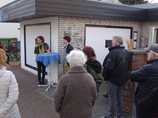 Lintorf. Die Lintorferin schaut durch die kleine rechteckige Öffnung im Schaufenster des Kunstbüdchens an der Speestraße. Juergen Staack, Düsseldorfer Künstler, [weiterlesen]