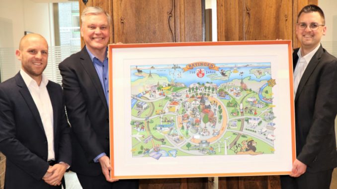 Ratingen. DKV Mobility, einer der größten Arbeitgeber der Stadt und europaweit tätiger Mobilitätsdienstleister, hat der Stadt Ratingen ein besonderes Geschenk zum 750‑jährigen Bestehen überreicht: ein eigens gestaltetes Wimmelbild, das historische Elemente mit Zukunftsvisionen verbindet und zeigt, wie sich Ratingen im Kontext moderner Mobilität und Energiewende weiterentwickeln könnte. „Ein Stadtjubiläum ist mehr als ein Datum – es ist ein gemeinsamer Meilenstein. Wir sind sehr froh, hier in Ratingen zu sein, nicht nur als Arbeitgeber, sondern als Teil einer starken Gemeinschaft,“ sagte Jesper Erichsen von DKV Mobility bei der Übergabe des Bildes an Bürgermeister Patrick Anders.