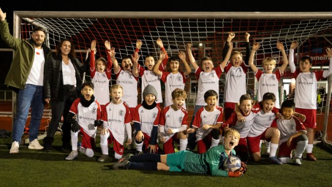 Lintorf. „Gemeinsam aktiv, das ist unser Motto“, sagen Kim und Pascal Fuchs (links), Geschäftsführer des Alltagsbetreuungsdienstes „Engel im Alltag Mettmann“. Sie haben für die U11 des SC Rot-Weiß Lintorf 1928 (RWL) einen neuen Trikotsatz übergeben.