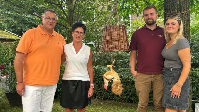 Lintorf. Die Einladung hatten König und Kronprinz der St. Sebastianus Schützenbruderschaft Lintorf 1464 noch am Krönungsabend am vergangenen Montag bekommen. Am Samstag dann waren das Königspaar Andreas und Nicole Nieß (von links) und das Kronprinzenpaar Julian Bohne und Leonie Müller beim Hahneköppen des Stammkorps.