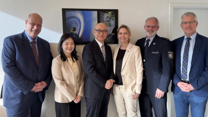Kreis Mettmann. Der japanische Generalkonsul Yoshitaka Tsunoda hat Landrätin Dr. Bettina Warnecke im Kreishaus seinen Antrittsbesuch abgestattet. Der Diplomat kam in Begleitung von Vizekonsulin Makoto Sugimura ins Kreishaus. Seitens des Kreises nahmen neben der Landrätin Holger Schepanski, Abteilungsleiter Polizei der Kreispolizeibehörde Mettmann, Dirk Haase, Leiter der Kreiswirtschaftsförderung sowie Martin Schlüter, Büroleiter der Landrätin, an der Gesprächsrunde teil.