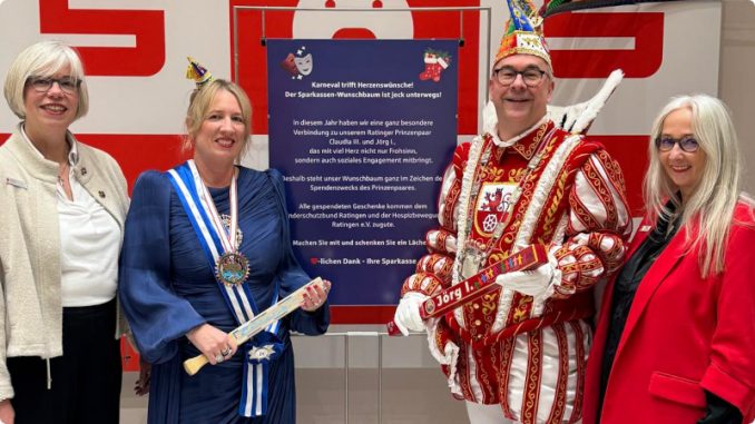 Ratingen. In der Ratinger Hauptfiliale der Sparkasse HRV ist er ein fester Bestandteil der Adventszeit: der alljährliche Weihnachtswunschbaum. Nun steht er wieder reich geschmückt in der Kundenhalle an der Düsseldorfer Straße und wartet auf Menschen, die Wünsche erfüllen möchten – die in Form von Herzen am Baum hängen. In diesem Jahr ist der Baum ein Gemeinschaftsprojekt der Sparkasse HRV und des Ratinger Karnevals-Prinzenpaars, und das aus gutem Grund: Die amtierende Ratingia Claudia III. ist im Hauptberuf Mitarbeiterin der Sparkasse. Deshalb unterstützt der Wunschbaum den Spendenzweck des Prinzenpaars. Alle gespendeten Geschenke kommen dem Kinderschutzbund Ratingen und der Hospizbewegung Ratingen zugute.