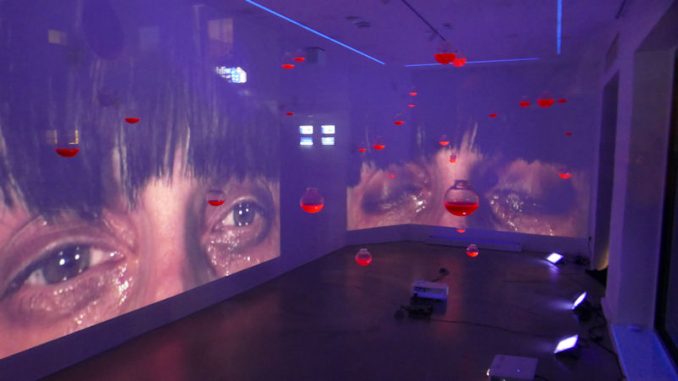 Lintorf. Zahlreiche Kunstliebhaber und -liebhaberinnen hatten sich gestern Abend trotz der niedrigen Temperaturen zum Kunstbüdchen auf der Speestraße begeben. Sabine Tünkers, die Erfinderin des Kunstbüdchens, hatte zur Vernissage mit der Künstlerin Irena Paskali eingeladen. „Salty Drops“ nennt Paskali ihre Installation, die sie im Inneren des Büdchens aufgebaut hat. Zarte Glaskugeln mit einer fluoreszierenden roten Füllung hängen leicht pendelnd von der Decke des Raumes an dessen Wänden per Video weinende Augen zu sehen sind. Jede Träne erzeugt einen kleinen Ton, der wie ein Tropfen Wasser klingt, der in einen Tontopf fällt.