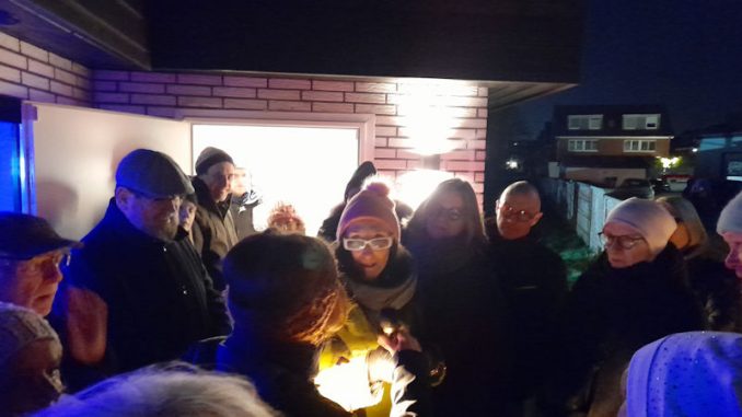 Besonders eindrucksvoll wirkt die Installation im Inneren des Büdchens in den Abendstunden, wenn das Schwarzlicht die Flüssigkeit in den Glaskugeln kräftig orange-rot leuchten lässt. Die Beleuchtungszeiten sind von 6 Uhr bis 9 Uhr und von 17 Uhr bis 23 Uhr. „Wir freuen uns auf viele Besucher und sind gespannt auf deren Emotionen, denn die Kunst entsteht erst in den Köpfen der Betrachtenden.“, erklärte Tünkers bevor sie die Gäste in das Büdchen hinein bat und draußen kleine Snacks und Getränke anbot.