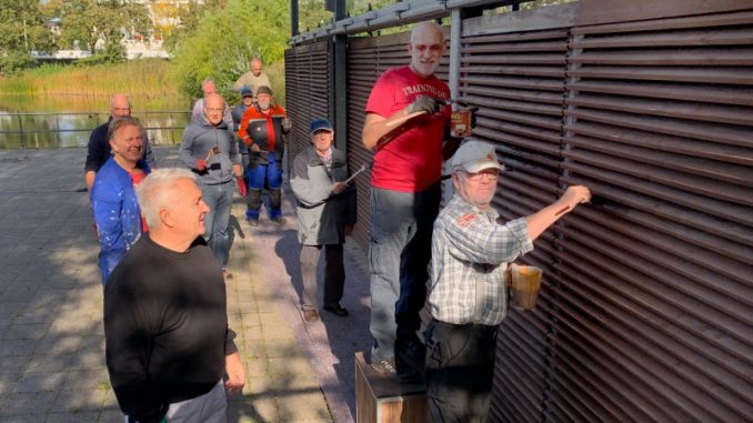 Nach einer Anfrage bei der Stadt gab es überraschend schnell grünes Licht für die Aktion, so dass am vergangenen Wochenende die Gunst des schönen Wetters genutzt wurde: Nach einem kurzen Aufruf hatten sich 14 Jonges zum Schleifen und Streichen eingefunden, darunter auch Clemens Michel, der mit fast 89 Jahren der älteste Helfer war. Hier mitzumachen war für ihn natürlich Ehrensache, schließlich gehe es doch um „unsere schöne Heimatstadt‟. Dafür ließ er sogar das Mittagessen zu Hause ausfallen. Auch der bekannte Ratinger Künstler Yildirim Denizli tauschte sein Atelier gegen die Freiluftstreichaktion und pinselte geduldig die verwitterten Holzlamellen.