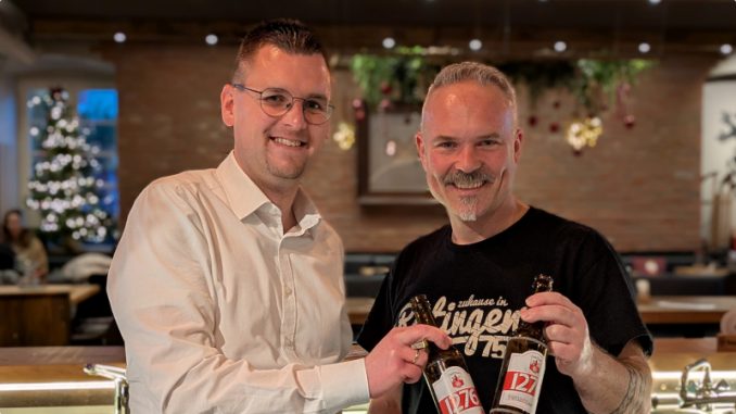 Ratingen. Auf den 749. Geburtstag der Stadt Ratingen stießen Bürgermeister Patrick Anders (links) und Bürgerhaus-Wirt Christian Pannes (rechts) an – standesgemäß mit dem extra gebrauten Jubiläumsbier, dessen erste Flaschen (fast) pünktlich zum Tag der Stadterhebung am 11. Dezember nach Ratingen geliefert wurden.