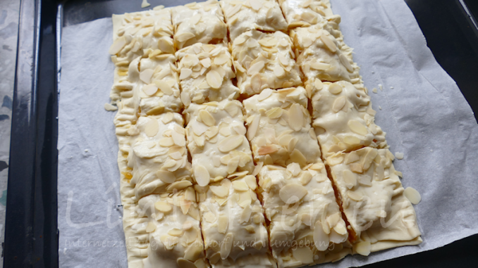 Den Blätterteig aus dem Kühlschrank nehmen und mit dem Papier auf dem Blech ausrollen. Die Teigplatte einmal halbieren und die angedickten Apfelstückchen auf einer Hälfte verteilen. Die zweite Teighälfte darüber legen und den Rand mit den Spitzen einer Gabel leicht andrücken. Die Teigoberfläche mit etwas Sahne oder Milch einstreichen und die gehobelten Mandeln darüber streuen. Die Teigplatte nun in etwa fünf mal fünf Zentimeter große Quadrate schneiden.