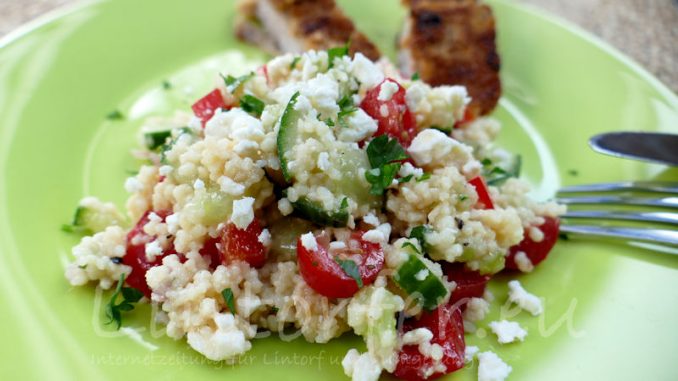 Für 4 Personen: 450ml Gemüsebrühe, 200g Couscous, 1 kleine Salatgurke, 1 rote oder gelbe Paprikaschote, 10 – 12 Cocktailtomaten, 125g Feta-Käse, 1 kleine rote Zwiebel; für das Dressing: 2 El Olivenöl, 2 El Zitronensaft, 1 Tl Honig, Salz und Pfeffer nach Geschmack, frische Petersilie