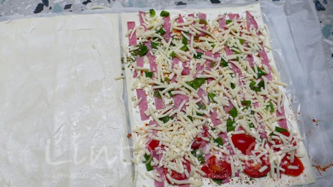 Für 4 Personen als Snack: 1 Blätterteigplatte, 125g Frischkäse (wahlweise Kräuter oder Natur), 2 Lauchzwiebeln, 2 -3 Scheiben Salami, 100g geriebener Emmentaler, 1 verquirltes Eigelb
