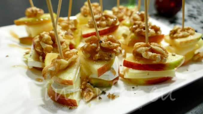 Für 24 Spieße: 24 kleine Holzspieße, 1 Camembert 200g (wer mischen will benötigt jeweils 75 g Brie, Emmentaler und Gouda), 2 – 3 Äpfel je nach Größe, 1 Handvoll Walnüsse, 2 El flüssigen Honig, 1 Tl Zimt, etwas Pfeffer,