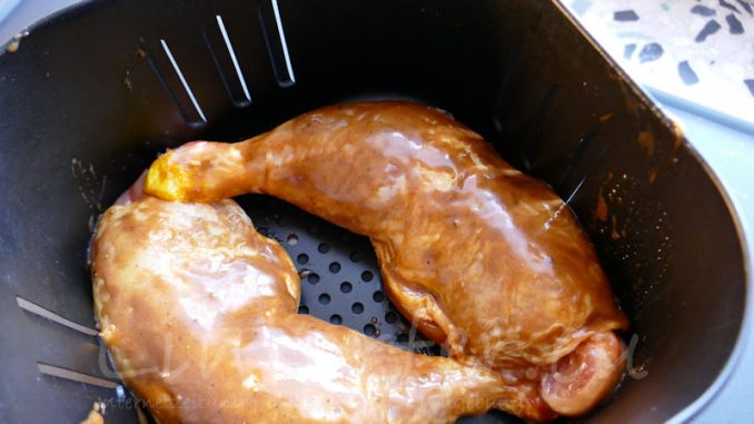 Aus Balsamico, Olivenöl und Honig eine Marinade anrühren. Diese mit Salz, Pfeffer und Paprikapulver würzen. Die Hähnchenschenkel von beiden Seiten damit einstreichen und etwa 15 Minuten einziehen lassen. Dank des eher festen Honigs vom örtlichen Imker, bildet die Marinade eine wunderbare Schutzschicht auf der Hähnchenhaut. Die Hähnchenschenkel so in den Korb der Heißluftfritteuse geben, dass sie nicht übereinander liegen und die Hautseite nach oben zeigt.
