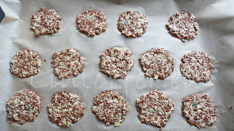 Den Backofen auf 200°C vorheizen. Zwei Backbleche mit Backpapier auslegen. Mit zwei Teelöffeln kleine Häufchen auf das Backpapier setzen und mit kreisenden Bewegungenzu flachen Crackern formen. Je flacher die Cracker sind, desto knuspriger werden sie beim Backen. Das Blech mit etwas Wasser bespritzen und die Cracker nacheinander auf der mittleren Schiene etwa 15 – 20 Minuten backen. Den Backofen in den letzten Minuten gut beobachten, damit die Cracker nicht zu dunkel und damit bitter werden.