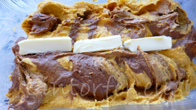 Unser Kuchen sieht etwas kleiner aus, da wir aufgrund der (vollkommen unbegründeten) großen Skepsis nur die Hälfte der angegebenen Mengen des Rezeptes verarbeitet haben. Kürbispüree haben wir aber gleich etwas mehr gemacht, um es einzufrieren. Schließlich lässt es sich später entweder wieder verbacken oder aber unter Kartoffelpüree rühren. Die zweite Hälfte des gekauften Kürbis haben wir während der Backzeit des Kuchens zu einer herzhaften Kürbissuppe verarbeitet. Auch die Butterstäbchen haben wir nur auf der Hälfte des Kuchens ausgelegt, um zu sehen, ob das Mehr an Butter geschmacklich wirklich etwas bringt. Die Mitte wird dadurch ein wenig „fudgy“, also schokoladig-weich, aber wir sind der Meinung, dass man sie auch sehr gut weglassen und somit ein wenig Fett sparen kann. (Um den Kürbis leichter schneiden zu können, haben wir ihn nur geviertelt entkernt und die Viertel dann in 2 Etappen für ca. 8 Minuten im Airfryer bei 175°C erhitzt. Dann war das Würfeln kein Problem mehr.)