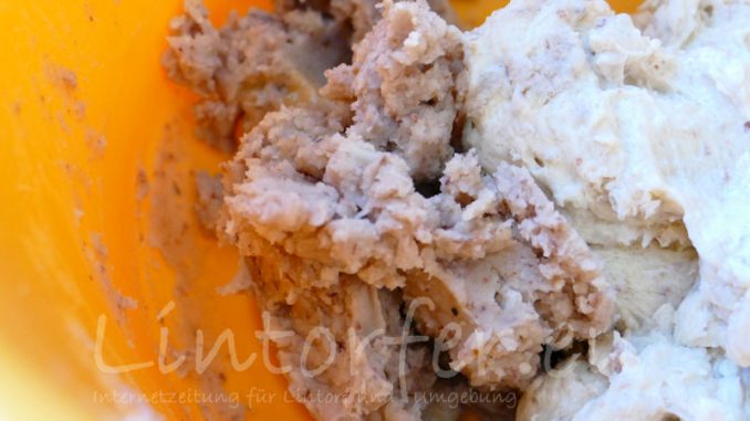 links – Maronenpüree, rechts – bereits ein wenig Teig eingearbeitet