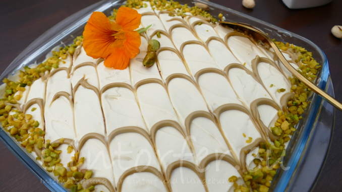 Nun die zweite Hälfte der Pistaziencreme in einen Gefrierbeutel geben und unten vorsichtig eine kleine Ecke abschneiden, so dass eine Öffnung von 3-4 mm entsteht. Mit diesem selbstgemachten Spritzbeutel parallel laufende Linien auf die Creme spritzen. Mit einem dünnen Holzstäbchen in entgegengesetzter Richtung durch die Linien ziehen und so ein Bogen- oder Wellenmuster erzeugen. Das Tiramisu für eine gute halbe Stunde kalt stellen und vor dem Servieren gehackte Pistazien auf den Rand des Desserts streuen. Wir lieben dieses Tiramisu und genießen es inzwischen regelmäßig nicht als Dessert sondern als Kuchen zu Kaffee und Tee. Gut abgedeckt lassen sich eventuelle Reste (gibt es bei uns quasi nie) auch noch sehr gut am Tag danach genießen.