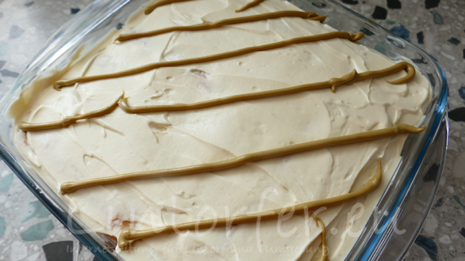 Eine eckige Auflaufform (ca. 30 x 30 cm) bereit stellen. Die Milch in eine flache Schale geben. Sahne, Mascarpone, Zucker und 2 El Pistaziencreme in einer Schüssel mit dem Handrührgerät kräftig aufschlagen bis die Masse schön cremig ist. Die Löffelbiskuit nun nacheinander in die Milch tunken und eine erste Schicht als Boden in die Auflaufform legen. Die Hälfte der Sahne-Mascarpone-Creme darauf verteilen. Weitere Löffelbiskuit in Milch tunken und eine zweite Schicht auflegen. Die restliche Mascarpone-Creme darauf geben und schön glatt streichen.