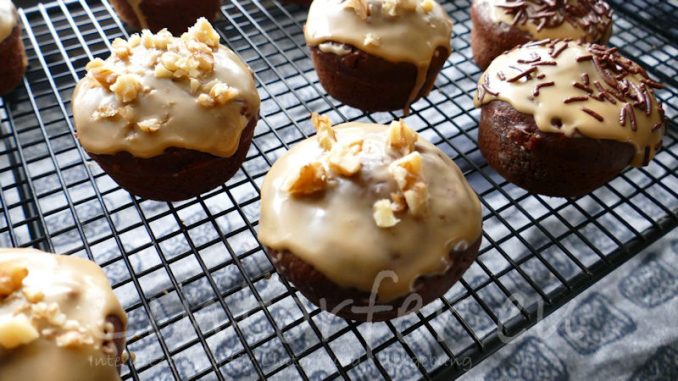 Den Puderzucker mit etwas Espresso anrühren bis er zähflüssig vom Löffel fließt. Die Muffins damit bestreichen und anschließend die restlichen gehackten Nüsse zur Dekoration verwenden. Für Nussallergiker kann man die Nüsse im Teig durch Schokostückchen und auf dem Zuckerguss durch Schokostreusel ersetzen.