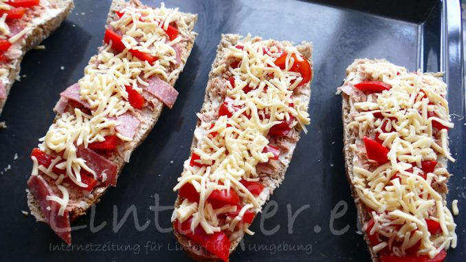 Für 2 Personen: 1 Roggen- oder Vollkornbaguette zum Aufbacken, ½ Packung Frischkäse, 1 Dose Thunfisch im eigenen Saft, 1 Paprikaschote, 2-3 kleine Tomaten, etwa 100g geriebenen Käse (Gouda oder Emmentaler)