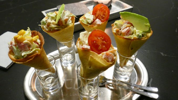 Anschließend werden sie im vorgeheizten Backofen bei 180°C für etwa 8-10 Minuten gebacken bis die Ränder goldbraun sind. Das Blech aus dem Ofen nehmen und die Hörnchen zum Abkühlen auf einen Kuchenrost stellen. Sobald sie nicht mehr zu heiß sind, kann man die Zahnstocher entfernen und die Hörnchen in kleine Schnapsgläser oder in einen Eiswaffelständer stellen. So lassen sie sich ganz einfach mit dem vorbereiteten Salat befüllen. Mit Tomatenscheiben oder Avocadostreifen dekoriert wirken die Hörnchen noch appetitlicher. Wer nicht ganz auf Fleisch verzichten will, kann gut ein wenig Hähnchenbrustfleisch in kleine Würfel schneiden, kross anbraten und zum Salat in die Hörnchen geben. Ebenso gut eignet sich in kleine Würfel geschnittener Hähnchen- oder Putenbrustaufschnitt. Den kann man allerdings auch direkt unter den Salat heben. Da die Füllung so etwas üppiger wird, sollte man beim Kauf die größeren Fladen wählen.