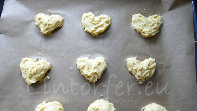 Mit zwei Teelöffeln oder mit einem Spritzbeutel ohne Tülle kleine Kreise (Ø ca. 5 cm) mit ausreichend Abstand auf das Backpapier geben. Um Herzen zu backen werden die Kreise mit einem Löffel nach unten vorsichtig zu einer Spitze ausgestrichen. Für die Einkerbung oben im Herz haben wir den Teig mit dem Rücken eines Tafelmessers eingedrückt und ein wenig nach unten über den Herzkörper ausgestrichen. Die Herzen müssen nicht weiter glatt gestrichen werden; das geschieht beim Backen ganz von allein, da das Gebäck sehr stark aufgeht. Je nach Dicke und Größe werden die Herzen oder Amerikaner nun in der Ofenmitte etwa 10 – 12 Minuten gebacken, bis der untere Rand leicht gebräunt ist. Das Blech aus dem Ofen nehmen und das Gebäck mit dem Backpapier auf einen Kuchenrost ziehen.
