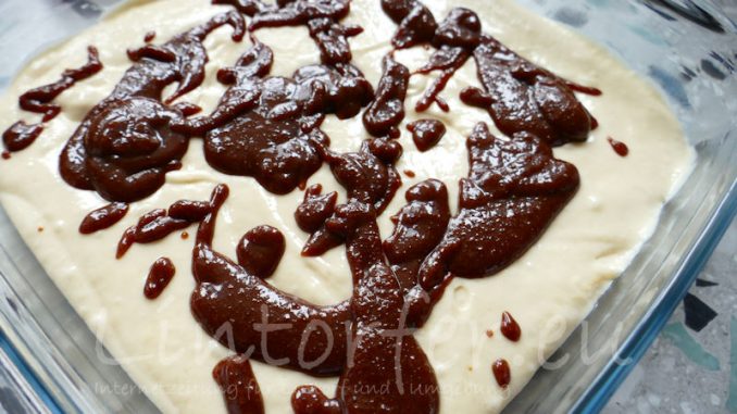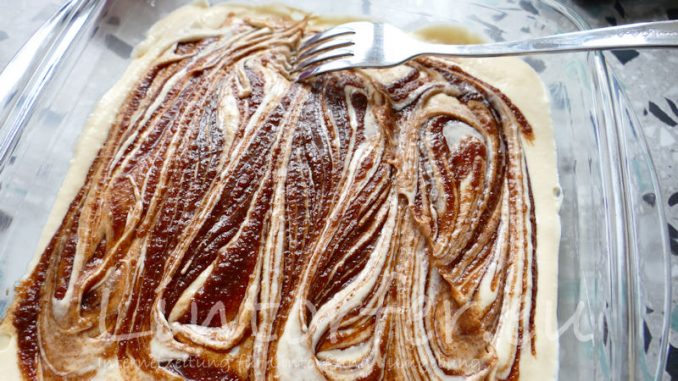 75g geschmolzene Butter mit Zucker, Zimt und etwas Mehl verrühren. Die Masse sollte zähflüssig vom Löffel tropfen. Anschließend die Zimtmischung in Klecksen auf dem Kuchenteig verteilen und mit einer Gabel oder einem Holzstäbchen in Wellen- oder Kreisbewegungen mit der hellen Teigmasse leicht vermischen.