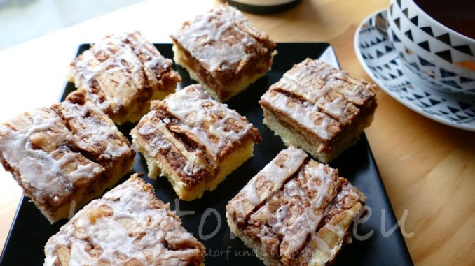 75g geschmolzene Butter mit Zucker, Zimt und etwas Mehl verrühren. Die Masse sollte zähflüssig vom Löffel tropfen. Anschließend die Zimtmischung in Klecksen auf dem Kuchenteig verteilen und mit einer Gabel oder einem Holzstäbchen in Wellen- oder Kreisbewegungen mit der hellen Teigmasse leicht vermischen.