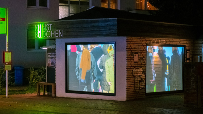 Es ist ein Spiel zwischen Außen und Innen, denn eigentlich steht die Menschentraube außerhalb und versucht einen Blick ins Innere des Kunstbüdchens zu erhaschen. Gleichzeitig aber befindet sich die Projektionsebene im Inneren, hinter der Schaufensterscheibe des Büdchens, zu sehen an den abgeschnittenen Beinen.