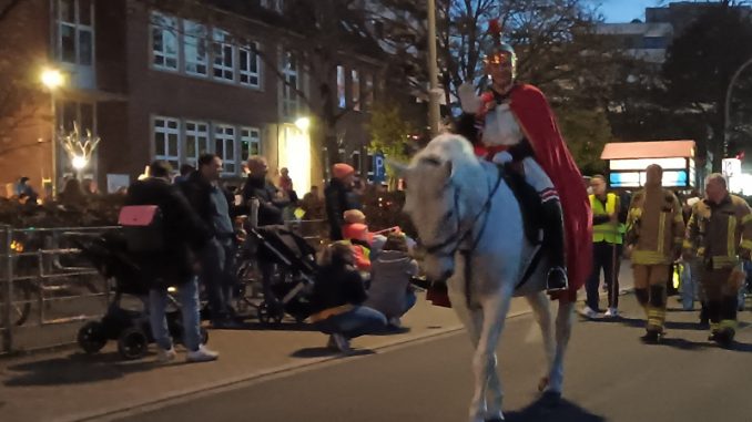 Lintorf. St. Martin wartete auf seinem Pferd auf dem alten Lintorfer Marktplatz auf die Kinder der Johann-Peter-Melchior-Schule (JPM). Dann zog er mit ihnen los, um die Schülerinnen und Schüler der Eduard-Dietrich-Schule (EDS) und der Heinrich-Schmitz-Schule (HSS) abzuholen und gemeinsam durchs Dorf zu ziehen. Die Martinslieder spielte das Tambourcorps Lintorf.