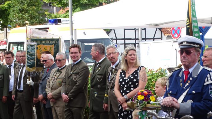 Der Parkplatz an der Speestraße war schon mit vielen Besuchern gefüllt, als die Schützen kamen. Im Laufe des Tages sollten es aber noch viele Gäste mehr werden, die bei herrlichem Wetter das umfangreiche Programm des Tages genossen. Begeistert waren die Lintorfer natürlich von ihrem Tambourcorps. Gemeinsam mit der Kapelle Stein brachten die Spielleute die Stimmung auf dem Platz zu einem ersten Höhepunkt.