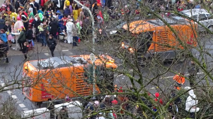 Die Reinigungskolonne der Stadt Ratingen, die mit geballtem Arbeitskräfteeinsatz unmittelbar hinter dem Kinderkarnevalszug die Straßen säuberte, war oftmals machtlos. Viele der Papier- und Plastikstreifen blieben in den Straßenbäumen hängen oder verstopfen jetzt die Regengullys.