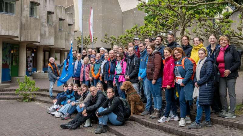 Am frühen Morgen wurde in Hösel ein erster Impuls gehalten. In bewegenden Worten wurde auf aktuelle Kriegsschauplätze und weltweite Konflikte eingegangen – ein Moment der Stille, des Gedenkens und der Hoffnung. Der weitere Weg führte durch das idyllische Angertal, während sich die ersten Sonnenstrahlen über der Landschaft ausbreiteten. Die Gruppe genoss eindrucksvolle Ausblicke auf Homberg und die Wiesen bei Wiesnasen, bevor sie über die Hofermühle entlang der Anger Richtung Heiligenhaus und Wülfrath weiterzog.