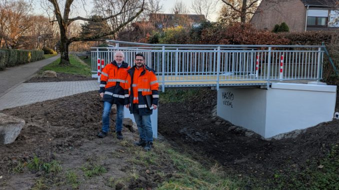 Ratingen-West. Die neue Brücke für den Fuß- und Radverkehr im Verlauf des Ebereschenwegs konnte am 15. Dezember für den Verkehr freigegeben werden. Damit ist eine Lücke Wegenetz des Grünzugs West wieder geschlossen worden. Die vorherige, etwa 50 Jahre alte Holzbrücke hatte wegen Baufälligkeit abgerissen werden müssen. Das neue Bauwerk ist deutlich breiter, robuster und mit einem rutschsicheren Belag aus glasfaserverstärktem Kunststoff ausgestattet. Das Geländer entspricht mit einer Höhe von 1,30 Meter den gesetzlichen Vorgaben. Für mindestens die nächsten vier bis fünf Jahrzehnte ist dieser Überweg über den Haarbach nunmehr gesichert.