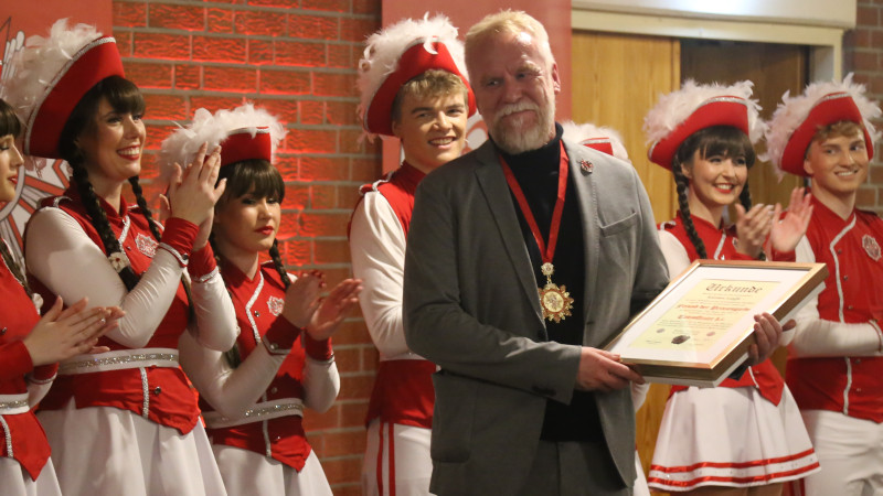 Weiterhin wurden einige Ehrungen vorgenommen. Mehrere langjährige Mitglieder wurden für ihre Treue und ihr Engagement im Verein ausgezeichnet. Eine besondere Ehrung ging dabei an Karsten Lauffs, der das BDK-Abzeichen in Gold mit Brillanten für seine Verdienste im karnevalistischen Tanzsport erhielt. Zusätzlich würdigte ihn die Prinzengarde mit einer ganz persönlichen Auszeichnung und verlieh ihm den Ehrentitel „Tanzoffizier h.c.“ als Zeichen der Anerkennung und Wertschätzung.