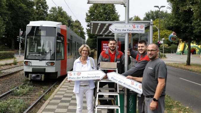 Düsseldorf. Die Rheinbahn und der Kinderschutzbund Düsseldorf machen gemeinsame Sache für Kinderrechte, die im Alltag sichtbar und erlebbar werden. Den Anfang macht eine neue Wegeleitung: Zehn Schilder führen jetzt von der Haltestelle „D-Volksgarten S“ zum „Platz der Kinderrechte“. So finden Besucherinnen und Besucher den symbolträchtigen Ort im öffentlichen Raum leichter – und seine Bedeutung bleibt nicht abstrakt, sondern wird konkret sichtbar. Die Schilder haben die Auszubildenden der Rheinbahn produziert, montiert und vor Ort angebracht.