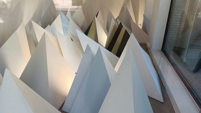 Aus den kristallinen Strukturen der sich auftürmenden Eisschollen Friedrichs sind im Kunstbüdchen aus dreieckigen Platten geschaffenen Körper geworden. Die Dreieckskörper mit einer offenen Seite verbergen ihre Machart nicht. Teilweise einsehbar zeigen sie, dass sie in möglicherweise bekannter Schnellbauweise hergestellt sind. Das so entstandene Arrangement, das das Kunstbüdchen zur Bühne werden lässt, wird zusätzlich durch starkes Kunstlicht zu einem Licht und Schattenspiel, das vor allem bei einsetzender Dunkelheit bis in die Nacht sich zu einem dynamischen und immer kraftvolleren Raumbild verändert.