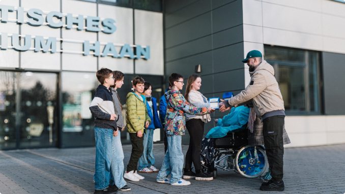 Der Erlös aus ihrem Auftritt kommt der Lebenshilfe Kreisvereinigung Mettmann zugute und unterstützt damit direkt Menschen mit geistiger Beeinträchtigung. Insgesamt 163 Euro überreichten die Schülerinnen und Schüler jetzt persönlich an Mathieu Giese, Leiter des Wohnhauses der Lebenshilfe in Ratingen. Giese besuchte das Gymnasium gemeinsam mit zwei Klientinnen, um den Kindern für ihr Engagement zu danken.