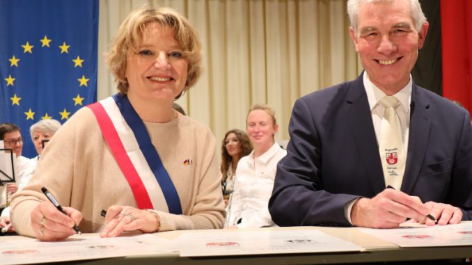 Ratingen. Mit einem Festakt im Ferdinand-Trimborn-Saal begingen Ratingen und Le Quesnoy ihr 60. Städtepartnerschaftsjubiläum. Bürgermeister Klaus  Pesch und seine französische Amtskollegin Marie-Sophie Lesne unterschrieben Urkunden, mit denen die sechs Jahrzehnte währende Freundschaft feierlich bekräftigt wurde. Neben einer 20-köpfigen offiziellen Delegation war auch die Stadtkapelle der nordfranzösischen Kleinstadt, die Harmonie Municipale Le Quesnoy, nach Ratingen gekommen. Sie gab ein gemeinsames Konzert mit der städtischen Musikschule Ratingen.
