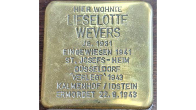 An ihrem 82. Todestag wird vor dem Haus Kohlstraße 9 in Hösel, dem damaligen Wohnort ihrer Familie, ein Stolperstein verlegt. Lieselotte Wevers ist das bisher einzige dokumentierte Ratinger Opfer des Euthanasie-Massenmordprogramms der Nationalsozialisten.