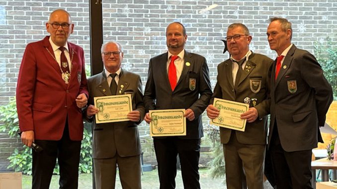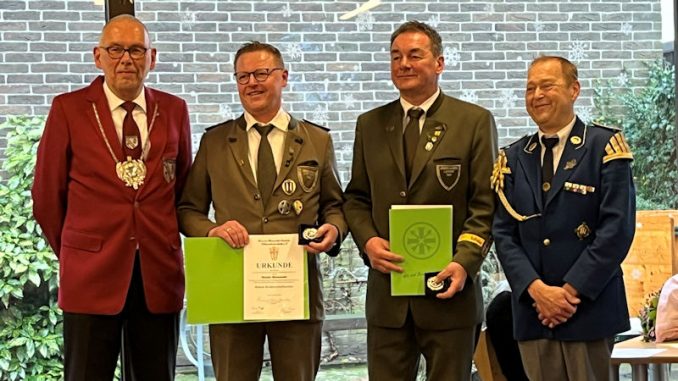 Den hohen Bruderschaftsorden für besondere Verdienste erhielten Carsten Blumenrath und Frank Bensberg. Weiter Schützen wurden für ihre langjährige Mitgliedschaft geehrt. Vierzig Jahre sind dabei die Kameraden Holger Korb, Manfred Pock und Heinz-Jakob Brüning. Fünfundzwanzig Jahre haben geschafft: Udo Cyroll, Joachim Kamin, Andreas Preuß und Stefan Frohnhoff. Sowohl Kellersmann als auch Groten bedankten sich ganz herzlich für das langjährige Engagement der Geehrten.