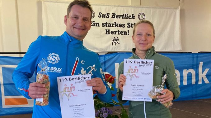 Ratingen. Steffi Schmidt und Karsten Hegemann vom Triathlon Team Ratingen 08 starteten bei den Bertlicher Straßenläufen in Herten auf der Halbmarathondistanz. Schmidt lief die 21,1 Kilometer in persönlicher Bestzeit (1:31:19 Stunde). In der Altersklasse (AK) 45 belegte Schmidt damit den ersten Platz. Karsten Hegemann war ähnlich schnell unterwegs. In 1:29:35 Stunden gewann er das Rennen in der AK 55. Er verbesserte seine acht Jahre alte Bestzeit um eine Sekunde.