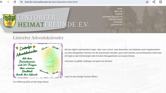 Lintorf. Der Lintorfer Adventskalender auf der Internetseite des Vereins Lintorfer Heimatfreunde ist spannend. Seit 1. Dezember wird dort jeden Tag eine Frage zu Lintorf gestellt. Drei Antworten werden geboten, nur eine ist richtig. Hat der Leser oder die Leserin die richtige Antwort gewählt, gibt es einen kleinen Text, der die Frage beantwortet.