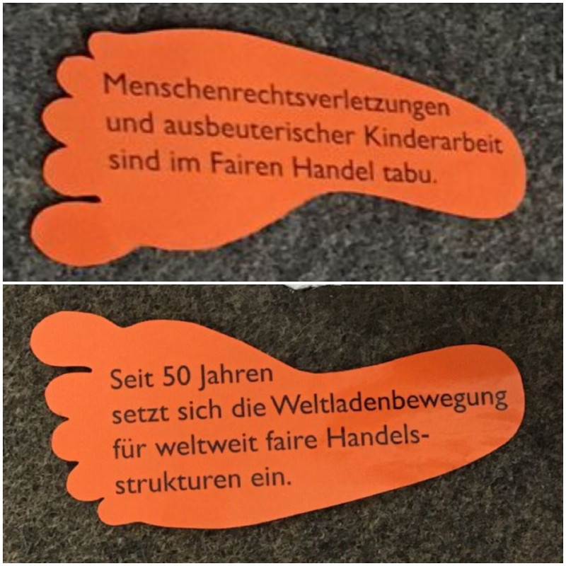 Orangefarbene Fußabdrücke (Foto unten) im gesamten Weltladen machten auf die Menschenrechtsverletzungen im Welthandel und ihre Folgen für die Menschen in den betroffenen Ländern aufmerksam. Ein „fairer Handel“, für den sich die Weltladenbewegung seit einem halben Jahrhundert einsetzt, ist notwendig, um den Menschen ein menschenwürdiges Leben zu ermöglich.