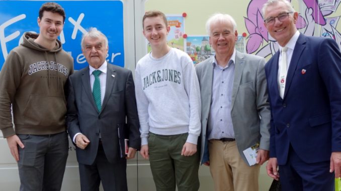 Ratingen. Eine positive Bilanz zieht das Jugendamt zum Saisonende des städtischen Spielmobils Felix. Rund 100 Mal ist der bunt bemalte VW-Transporter mit den lustigen Figuren vom Knax-Club der Sparkasse HRV von März bis in den Oktober hinein in allen Stadtteilen im Einsatz gewesen. Zu den Höhepunkten in diesem Jahr zählen unter anderem die Schenkung einer Riesendartscheibe durch den Rotaract Club sowie ein Gruppenbild am Spielmobil mit NRW-Innenminister Herbert Reul (Foto) beim Fest auf Schloss Linnep zum 50. Jahrestag der Gebietsreform. Das Spielmobil legt jetzt bis zu den Ratinger Spieletagen am ersten Osterferienwochenende eine Winterpause ein.