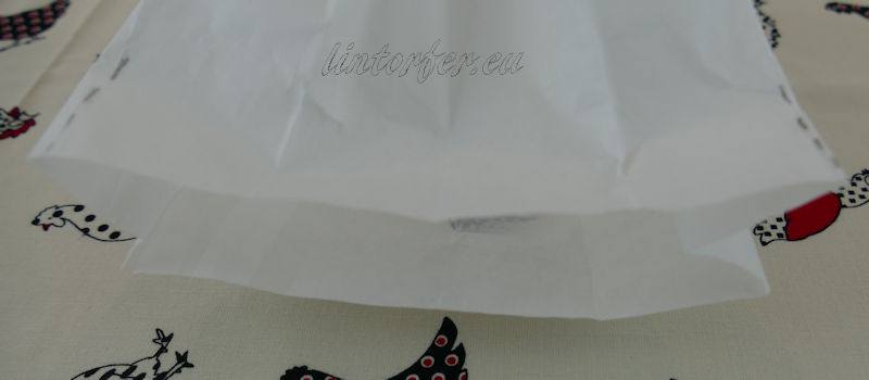 Anschließend fasst man die offene Seite quer zum gestalteten Kükenoberteil zusammen. An beiden Seiten dann einen 3 cm breiten Streifen (s. gestrichelte Linie) jeweils einmal vor und zurück falten. So lässt sich der äußere Rand leichter nach innen falten. Die gestrichtelte Linie wandert daraufhin an den äußere Rand der Tüte. Es ist eine Kellerfalte entstanden, das Küken unten etwas schmaler und dadurch standfester machen.